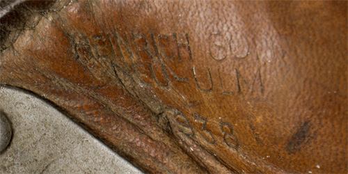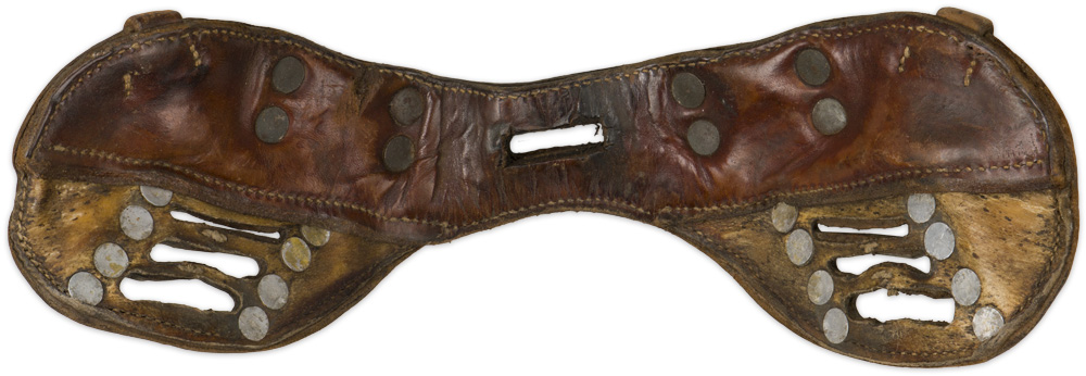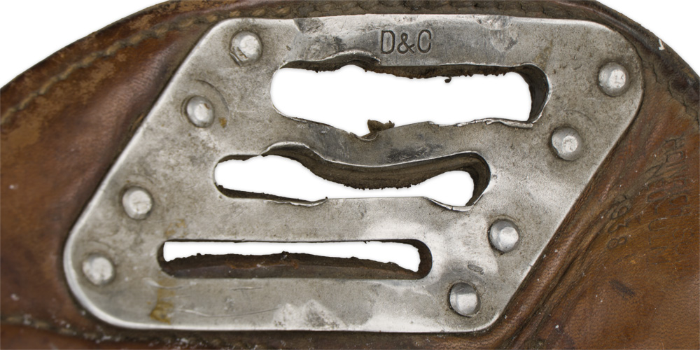 PHYSICAL DESCRIPTION: Central coupling device for the left and right saddle bags. Leather and tooled steel construction. Roughly 43cm x 13cm. Complete with all hooks and straps. Maker marked and dated for 1938. Shows period use and age.