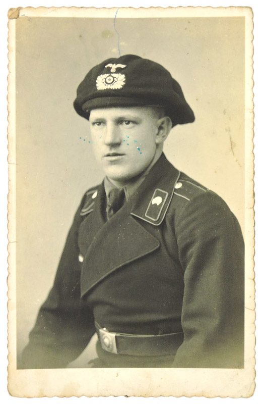 WW2 German Studio Portrait of a Panzer soldier wearing the black Panzer beret with the black Panzer wrapper. Black collar tabs with Panzer skulls affixed, Unknown Waffenfarbe color on collars, shoulder straps and collar tabs. Mimosa paper, reverse shows age, wear and stains. 9cm x 14cm. Excellent image with crisp detail showing the early crash helmet with beret.