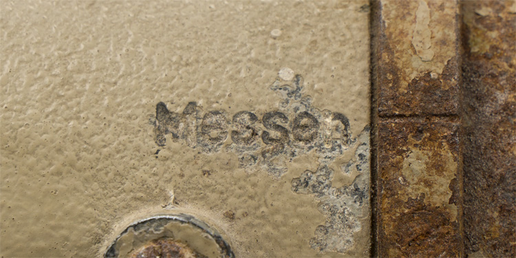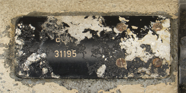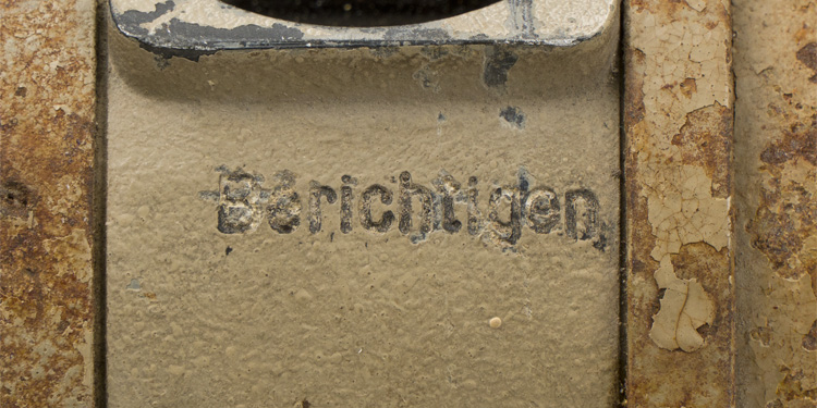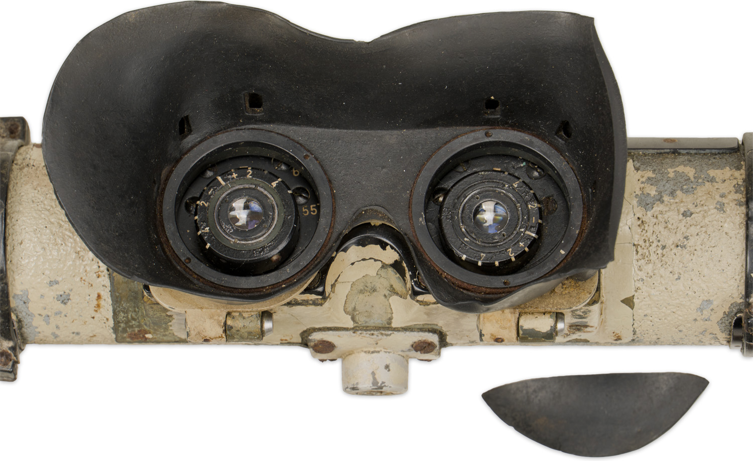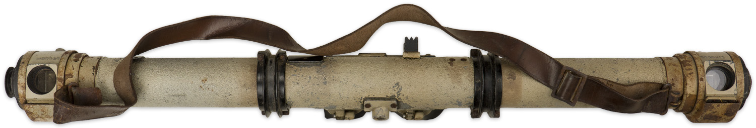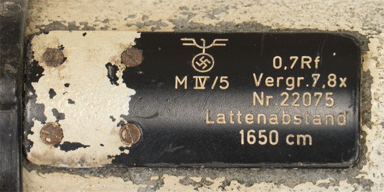 A 81cm long metal rangefinder painted in a light tan/grey with a rubberized forehead/face rest that has the right side broken off (but included) and a crack to the left side. The brass plate shows an eagle with "MIV/5, 0.7 Rf, Vergr. 7.8x, Nr. 22075 Lattenabstand, 1650cm". The second brass plate has chipping and marking that makes it impossible to read with the exception of the numbers "31195". The optics are spotted with the markings partially faded. A cap with "H" to one end is in place that represents "Hohen" or "Height", while the opposite knob for distance is missing. The leather end pieces are missing, but the leather strap is included. The rangefinder shows heavy usage and wear, with oxidation to either end which stop adjustmentsMarked with the impressed manufacturers three letter code, "dow" indicating manufacture by Opticotechna G.m.b.H.