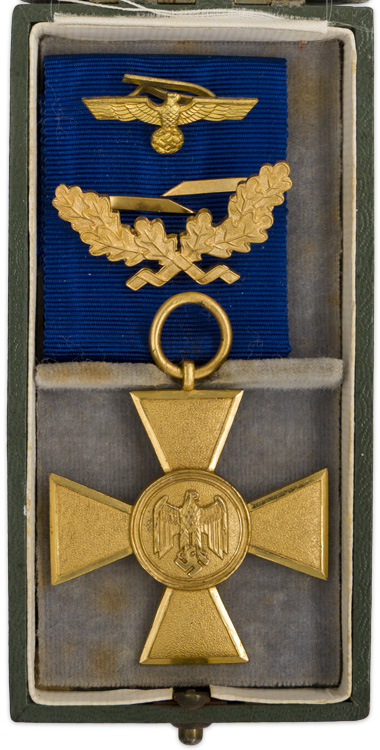 BACKGROUND: On March 16TH 1936, one year after the reintroduction of military conscription, Adolf Hitler instituted the Armed Forces Long Service Awards to reward military personnel, in all branches of service, for loyal long service. The awards were established in four classes for four, twelve, eighteen and twenty-five years service respectively. Of Note: On March 10TH 1939 Hitler expanded the series of Armed Forces Long Service Awards with the introduction of a gilt oak-leave device to be attached to the ribbon of the twenty-five year service award to indicate forty years service. This example is the first class medal awarded for twenty-five years of loyal service.