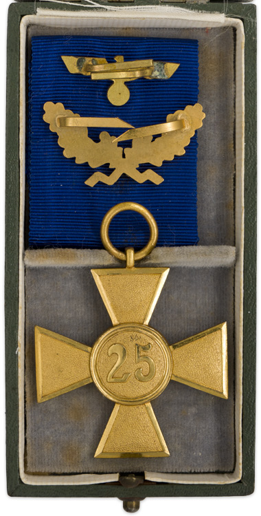 PHYSICAL DESCRIPTION: Die struck manetic construction medal with a fire gilt finish is in the form of a cross Pattée with a circular centerpiece with the obverse centerpiece featuring an embossed Wehrmacht style eagle with down-swept wings and the reverse centerpiece featuring the embossed numeral, "25". The crosses arms and centerpieces all have a subtly pebbled background field with dual, fine, embossed, smooth outer edge stripes to the centerpieces and a fine, embossed, smooth outer edge stripes to the arms. Original ribbon and eagle and 40 year cyphers (never attached) and the original case. Nice!!!
