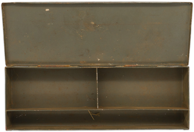 Weapons maintenance was of utmost importance to sustain effective results in combat. To ensure proper maintenance of the weapons specially trained Unterwaffenmeister’s, (Weapons Maintenance Sergeants), were assigned to all Infantry units. These Unterwaffenmeister’s were equipped with a specific set of tools enabling them to perform field repairs and maintenance on all the basic Infantry weapons.PHYSICAL DESCRIPTION: Feldgrau painted metal tin. 18cm x 6.5cm x 3cm.