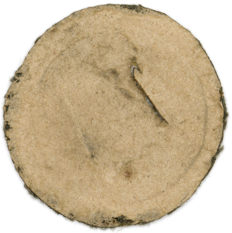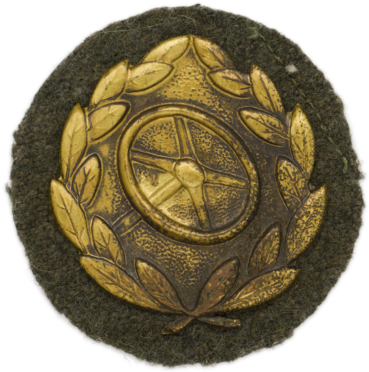 PHYSICAL DESCRIPTION: Stamped sheet metal badge with a gilt wash. The badge is in the form of an embossed, circular laurel leaf wreath encompassing an embossed steering wheel on a pebbled background field. The badge is complete with a circular, magnetic sheet metal backing plate, original wool and both of the bent over attachment prongs are intact.