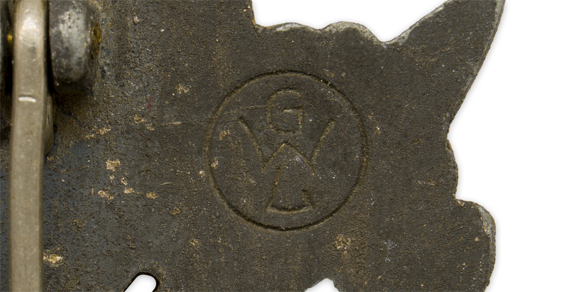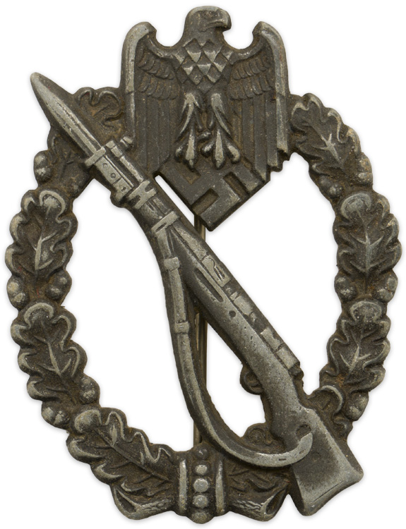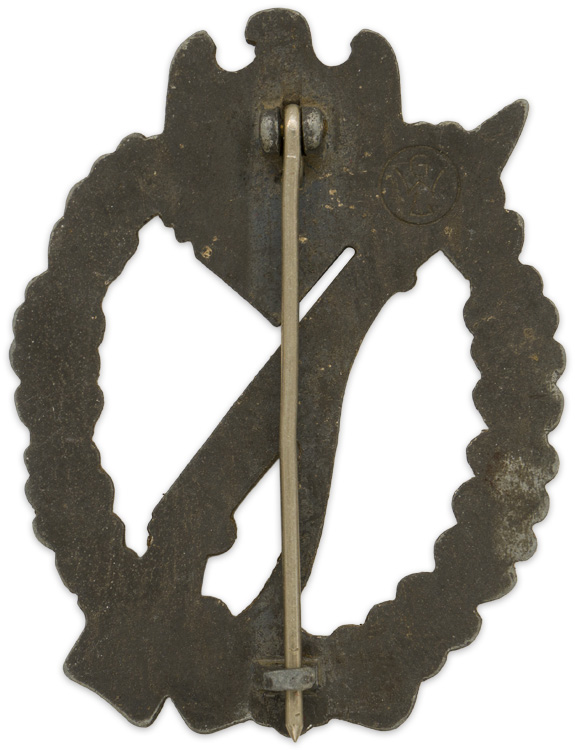 PHYSICAL DESCRIPTION: Injection molded, zinc construction, solid backed, badge with a silver wash features an embossed, vertically oval, oak-leaf wreath with a Wehrmacht style eagle with down-swept wings, clutching a canted swastika in its talons, superimposed to the top center, encompassing a cut-out, bolt action, rifle with a fixed bayonet and a sling. The solid reverse has an integral, molded, hinge, a thin, round, vertical, pin and an integral catch all intact. The reverse of the badge is well marked with the stamped, somewhat stylized, manufacturer’s initials within a circular border, "GWL", indicating manufacture by Gebrüder Wegerhof of Lüdenscheid.