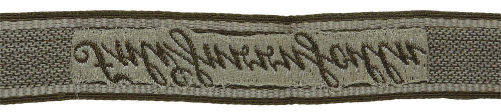 PHYSICAL DESCRIPTION: Roughly, 1 1/4" tall, 20" long, machine woven, tan rayon construction cufftitle with a repeating, interwoven, waffle pattern and machine, "BeVo", woven, Sütterlin style script "Feldherrnhalle" in silvery/grey celleon threads. The cufftitle is bordered at both the top and bottom edges in six strand, horizontally woven, silvery/grey celleon threads. The reverse of the cufftitle has loosely woven, vertical, silvery/grey celleon threads around the script and the script is in a tan rayon mirror image ob the obverse.