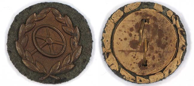 PHYSICAL DESCRIPTION: Stamped magnetic alloy award with a bronze wash. Badge is in the form of an embossed, circular laurel leaf wreath encompassing an embossed steering wheel on a pebble background field. Complete with prongs and original backing plate and wool.
