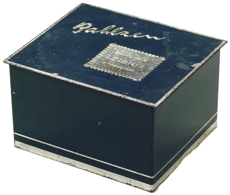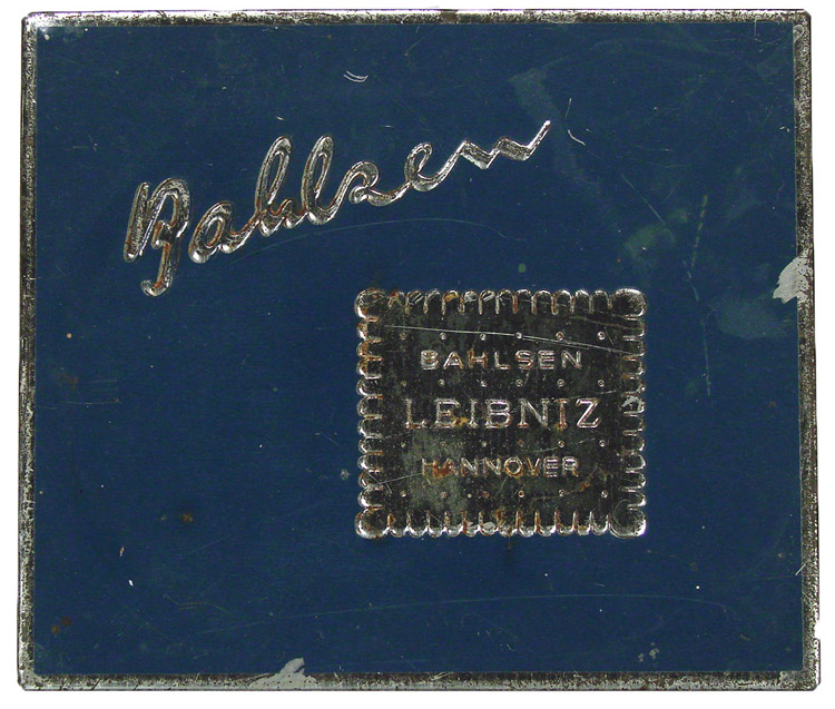 . (Behälter)A two piece magnetic, sheet metal alloy container measuring approximately 15cm x 9cm x 12cm that contained Bahlsen brand Leibniz biscuits or crackers (Keks).
