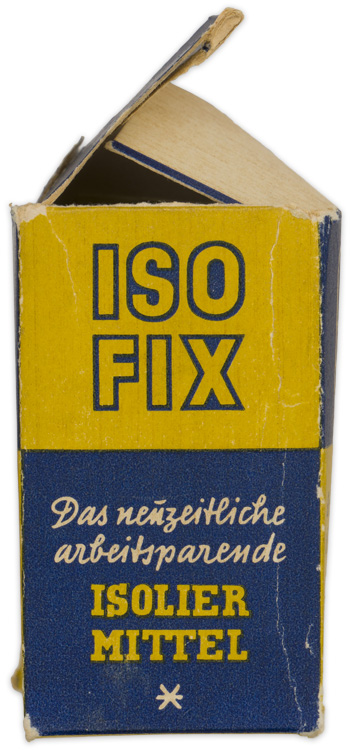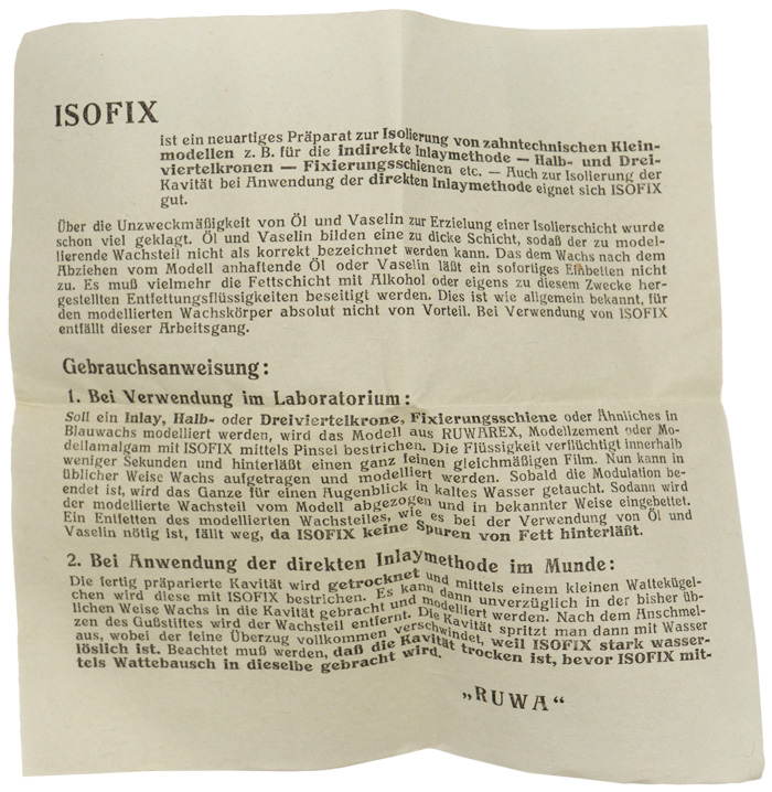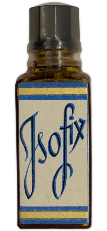 (Isoliermittel)A bottle of "Isofix" (which is an insulator for teeth) with the original carton. The bottle still contains on quarter of its original contents with a ribbed bakelite cap. The bottle measures approximately 2.5cm x 7cm. The box measures approximately 4cm x 7cm with the top lid torn away from the body, but included. A typewritten sheet of instruction is included.