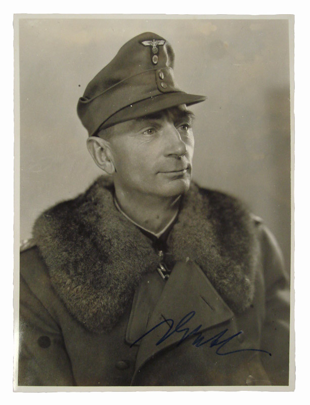 PHYSICAL DESCRIPTION: Roughly, 6 3/8" x 4 3/4", black and white, close-up, portrait style of Generalleutnant Eduard Dietl wearing a Mountain Troopers cap and a double breasted wind jacket with a large, lay down fur collar. The only clearly visible uniform details are the cap insignia although a part of a shoulder board and Dietl’s Knight’s Cross and Oak-leaves are just partially visible. The photograph has Dietl’s blue ink signature running across his chest. The photograph is in overall very good condition with minor age yellowing and some light spotting.