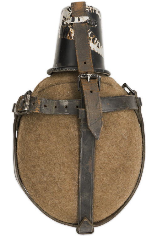 PHYSICAL DESCRIPTION: Standard issue, 1 1/2 liter capacity, tooled natural aluminum construction mountain troops and medical personnel’s canteen with a black painted, tooled, aluminum cup and a blackened leather harness with alloy fittings. The roughly, 8 3/4" tall, 6 1/2" wide, 3 1/4" thick, vertically oval, tooled, natural aluminum construction canteen is contained in a slightly mottled, brownish felt cover with four, black painted, alloy, closure snaps, machine stitched seams and a multi-piece, vertical and horizontal blackened leather carrying harness. The blackened leather harness consists of four, vertical, straps with one positioned to the center of both the obverse and reverse and one to each side. The four, vertical, straps are all stitched to a fifth, horizontal, strap situated just below the throat of the canteen. The vertical straps to the obverse and sides all have a blacked painted, pronged, alloy, roller buckles while the vertical strap to the reverse was designed to secure the cup to the top of the canteen with the pronged roller buckle on the obverse. The reverse, vertical strap also has an additional cap retaining strap, rivetted onto the screw off canteen cap and a rivetted on alloy belt support hook. The buckles to the vertical, side, straps were to secure the separate, detachable shoulder strap. The separate, detachable shoulder strap is absent. All four vertical straps have an additional, blacked painted, pronged, alloy roller buckle where the straps overlap at the bottom center of the canteen. The canteen has a tooled, natural aluminum, screw on cap with vertical ribbing to the top edge and a, rivetted on, leather retaining strap all intact. The canteen comes complete with a black painted, tooled aluminum construction, 1/4 liter capacity cup. The roughly, 3" tall, vertically, cylindrical, cup has a 3" x 2 3/4" outwardly fluted, oval mouth with a rolled back lip to the top edge, a raised, brazed on, strap retaining bracket to the obverse and a 1 3/4" diameter bottom. The cup retains about 55% of its black paint with large spots of wear to the base aluminum. The body of the canteen, has the impressed date, "29" but the canteen and all the components have no visible manufacturer’s markings. The canteen and cover are in overall fairly good condition with minor age and usage toning but the leather straps have stiffened with age and show some light surface cracking.