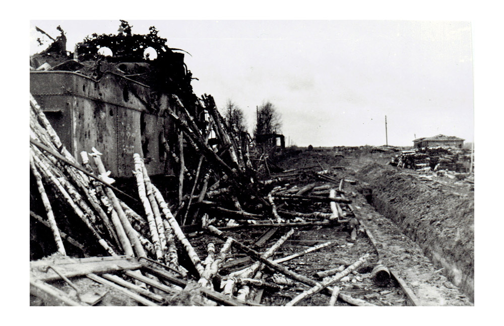 (Photographie)A 9.5cm x 6cm, black and white photograph. Looks like it was hit with an artillery or air strike.
