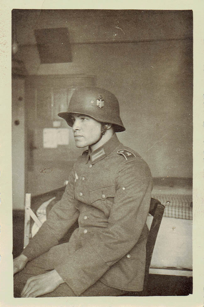 (Photographie)A 8.5cm x 5.5cm, black and white photograph. Image of a Heer soldier with nice uniform detail. Transitional helmet.