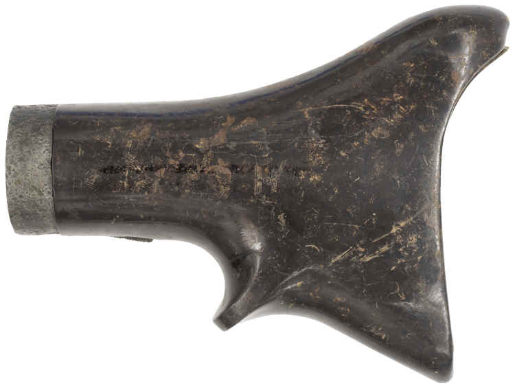 Molded mottled brown bakelite construction stock for the MG34 with tooled, blued steel fittings. Stock has an open, circular, blued steel fitting with spring loaded locking clip, to attach it to the body of the MG. Spring loaded locking clip still functions. The circular attachment fitting is secured to the stock by an internal, long necked screw with the screw head accessible at the butt plate of the stock. Butt plate has repeating horizontal grooves for better grip. This example is the later production model with-out the steel protective panels to the top and bottom corners of the butt plate. Some pitting to the metal fitting, but still functions fine.