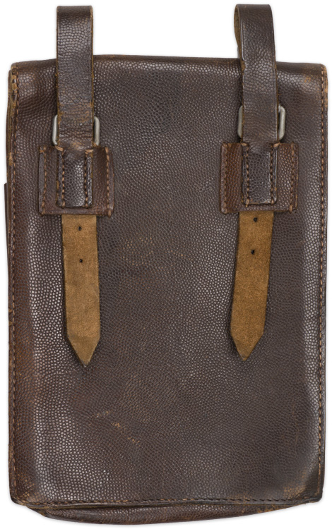 PHYSICAL DESCRIPTION: Brown, pebbled leather construction, first pattern, M35 map/dispatch case with steel fittings. The case is roughly, 27cm tall, and 19cm wide, and 5cm thick, with folding, accordion, expanding side panels. The case has a fold over top closure flap with a machine stitched on, vertical closure strap which attaches to a leather reinforced, magnetic sheet metal, pronged roller buckle which is machine stitched to the bottom center of the cases body. The front of the case features a vertical ruler pocket to the left side, seven central, vertical pencil holders and a small vertical pocket to the right side with an internal quick release pull tab. When in the closed position the top fold over flap covers the top openings of the ruler, pencil and tool pockets to ensure against losing the items. The reverse of the case has two, machine stitched on, vertical belt loop straps with magnetic sheet metal, pronged length adjustment roller buckles. The natural tan leather interior of the case has two compartments with a central, blackened, simulated leather separating panel. The interior of the case also has protective panels to both of the top side panels positioned underneath the top fold over flap. Faint property stamp to inside front flap. Nice case!