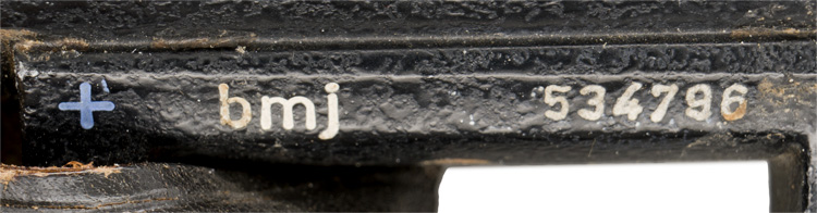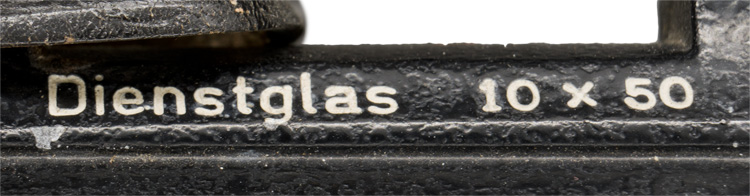 PHYSICAL DESCRIPTION: Tooled alloy construction, 10 x 50, power, (10 power magnification with a 50mm diameter objective lens), binoculars with black bakelite fittings. Body retains a good portion of its original finish. The binoculars have molded, black bakelite eye sockets which are fully intact and the focus adjustment still functions. The optics are slightly smokey and have some minor fungal spotting. The right lense has a horizontal reticle pattern with vertical bars emanating from the center, outward, to either side in increments of 10 degrees up to 40 degrees to each side. The central lense joining bracket with swivel width adjustment is intact and still functions. The central lense joining bracket is well marked with impressed designation, "Dienstglas 10 x 50", (Service Glasses), serial number, "534796", and the manufacturers code, "bmj", indicating manufacture by M. Hensoldt & Söhne Wetzlar. The binoculars come housed in their original, tall, kidney shaped, molded, blackened leather construction carrying case with steel and sheet metal fittings. The case features a fold back top lid with a wide, rivetted on, horizontal, leather hinge to the reverse and a vertical spring loaded magnetic sheet metal closure clip with web pull tab to the obverse. The reverse hinge also acts as a belt loop and the obverse closure clip attaches to a steel stud situated on the front body of the case. The closure clip is well marked with impressed manufacturers code and date, "frn 44", indicating the clip was manufactured by Rudolf Lang Brandenburg/Havel in 1944. The sides of the case each have a rivetted on, "T" shaped, magnetic sheet metal panel with a raised swivel attachment bar for the securing the shoulder carrying strap. The interior of the top lid has an inset wooden panel rivetted in place with two small circular recess with protective black wool inserts for extra lenses and a rivetted on blackened leather retaining strap with a single snap closure. One extra lenses is present. Also comes with the bino neck strap & button hole tab. Nice set.