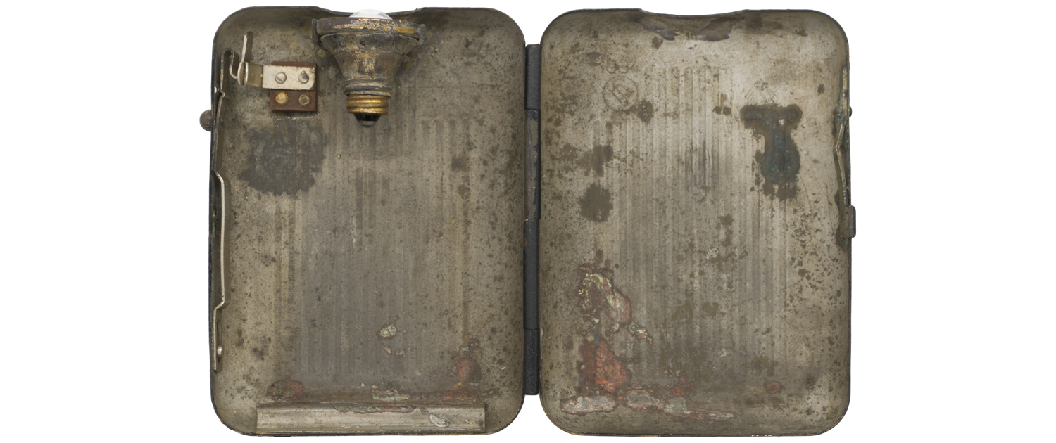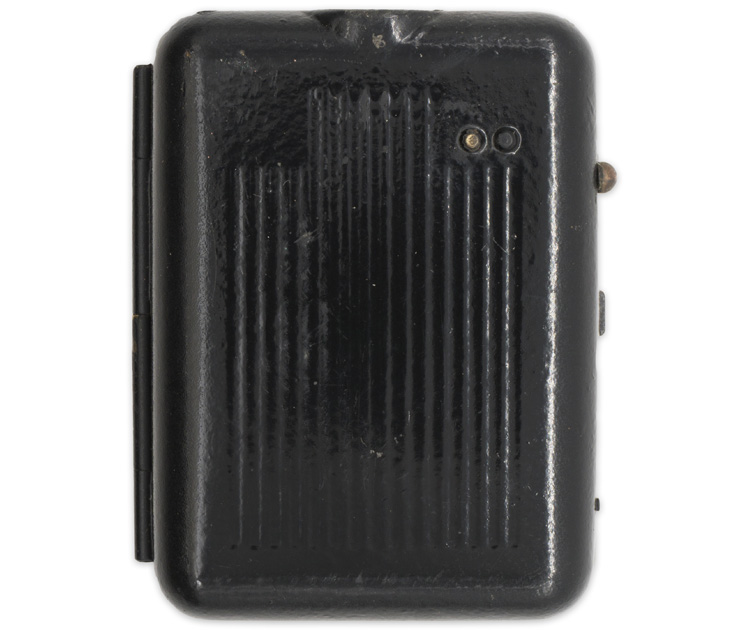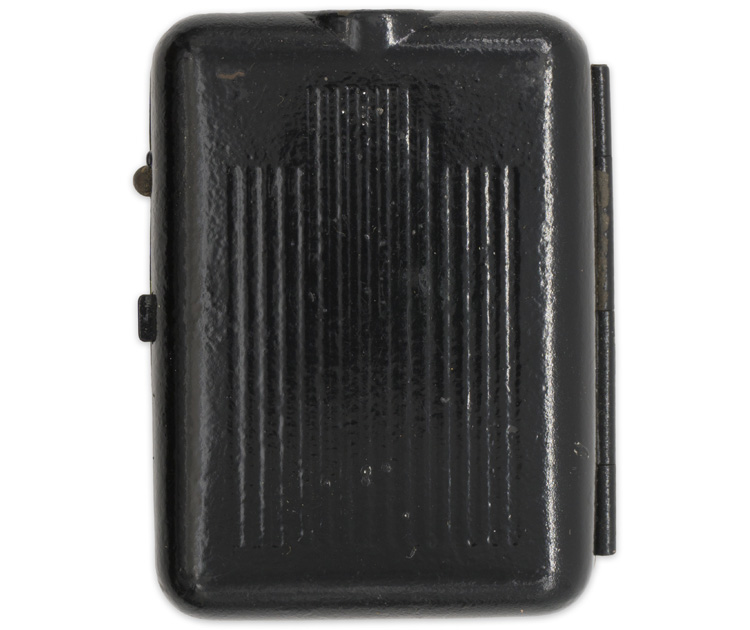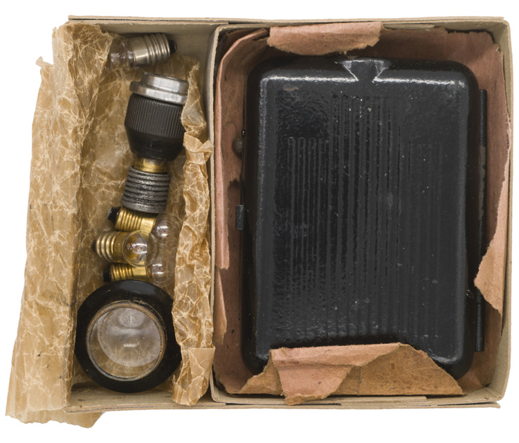 A 1930's flashlight in Original Box with Spare Parts. Very interesting German flashlight manufactured by the firm of Elektrodauerlichtfabrik Hans Falk of Berlin for military use, with Reichswehr Waffenamt acceptance stamp. Lamp is dated 1934 inside (stamped into the metal) with a maker’s logo below the date. The Waffenamt stamp is opposite the date. This is the type of flat-ish pocket flashlight which used the standard Flachbatterie. Comes in its original cardboard box with the makers label on the top of the box. A separate compartment in the box holds spare bulbs (which may be postwar-manufactured) and a number of different adapters and connectors which screw into the bulb socket in different ways for varying bulb sizes. Constructed of a black finished tin body (enameled?) with a removable heavy glass lens. The glass lens fits in place when the hinged metal body is snapped shut. The various adapters would be used for some unknown purpose without the glass lens. Unusual to find this complete in the original box. A recent old garage find in Germany.