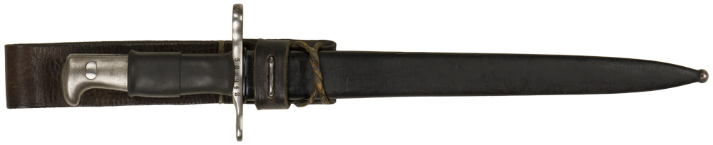 A 42cm long bayonet (in overall length) with a 30cm long bright blade that is faintly marked "Waffenfabrik" and is nicely marked with the serial number "322942" as well as a Swiss cross marking. The release button is in good working order. The pommel has a black rubber sleeve. Included is a black painted scabbard that also bears a Swiss cross to the ball tip and a leather rivetted frog.