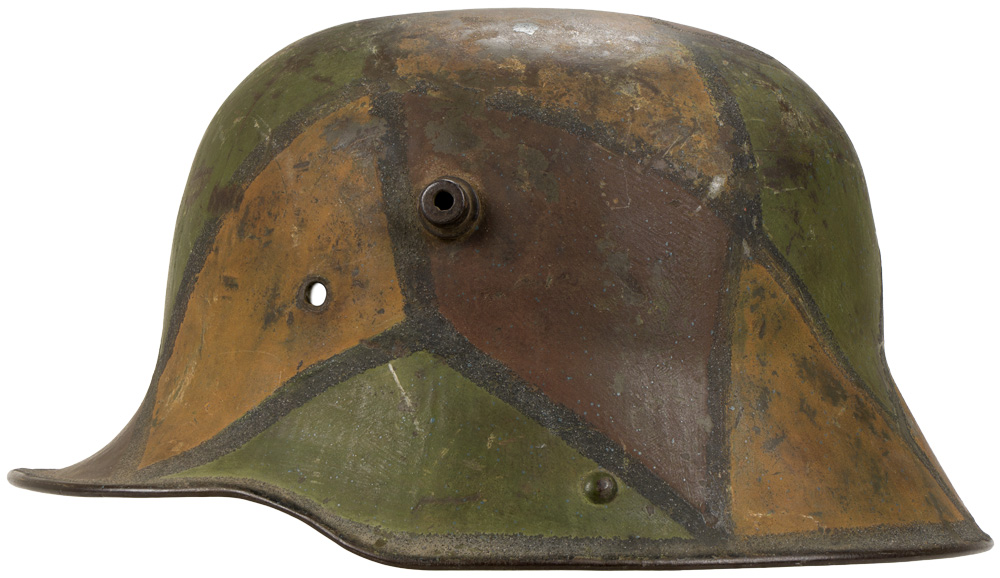 BACKGROUND: The first "modern" steel helmets were introduced by the French army in early 1915 and were shortly followed by the British army later that year. With plans on the drawing board, experimental helmets in the field, ("Gaede" helmet), and some captured French and British helmets the German army began tests for their own steel helmet at the Kummersdorf Proving Grounds in November, and in the field in December 1915. An acceptable pattern was developed and approved and production began at Eisen-und Hüttenwerke, AG Thale/Harz, in the spring of 1916. These first modern M16 helmets evolved into the M18 helmets by the end of WWI. The M16 and M18 helmets remained in usage through-out the Weimar Reichswehr era and on into the early years of the Third Reich until the development of the smaller, lighter M35 style helmet in June 1935. Of Note: In July 1918 Chief of the General Staff of the Field Army, Erich Ludendorff issued a directive which clearly laid out the camouflage colors and pattern that was to be applied to all helmets in the field. The directive also included the amounts of paint that 1,000 helmets would require as five kilograms, (11Lbs), each of, green, ochre yellow and rust brown, and two kilograms, (4.4 Lbs), of black paint.