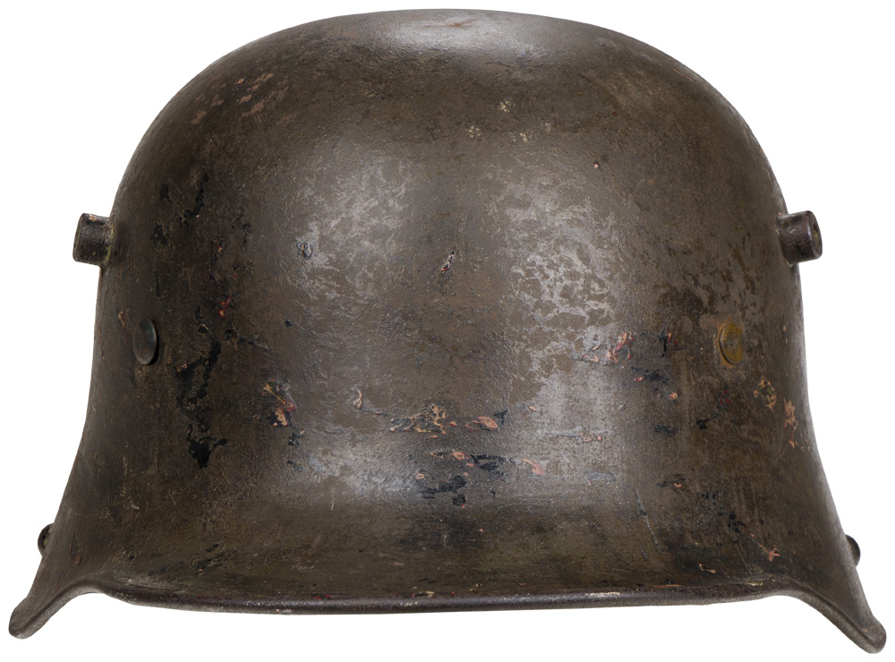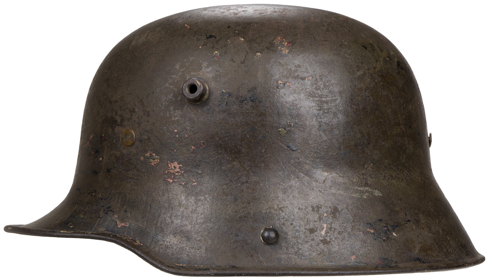 BACKGROUND: The first "modern" steel helmets were introduced by the French army in early 1915 and were shortly followed by the British army later that year. With plans on the drawing board, experimental helmets in the field, ("Gaede" helmet), and some captured French and British helmets the German army began tests for their own steel helmet at the Kummersdorf Proving Grounds in November, and in the field in December 1915. An acceptable pattern was developed and approved and production began at Eisen-und Hüttenwerke, AG Thale/Harz, in the spring of 1916. These first modern M16 helmets evolved into the M18 helmets by the end of WWI. The M16 and M18 helmets remained in usage through-out the Weimar Reichswehr era and on into the early years of the Third Reich until the development of the smaller, lighter M35 style helmet in June 1935. Of Note: In July 1918 Chief of the General Staff of the Field Army, Erich Ludendorff issued a directive which clearly laid out the camouflage colors and pattern that was to be applied to all helmets in the field. The directive also included the amounts of paint that 1,000 helmets would require as five kilograms, (11Lbs), each of, green, ochre yellow and rust brown, and two kilograms, (4.4 Lbs), of black paint.