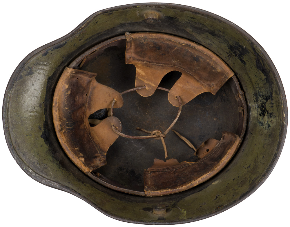 PHYSICAL DESCRIPTION: The stamped, sheet steel construction, helmet retains looks like it had camo at one time or some other type on overpaint? This can be seen around the inside apron as well. The helmet has both the dome headed chinstrap retaining rivets, both of the extended ventilation side lugs and all three of the flat headed liner retaining rivets. The interior of the helmet has a pre-May 1917 pattern leather liner. Liner pins are replaced. The pads (tips on one of the pads is broken) and stuffing are present, but have been restored to the helmet as it seems a bit too small. Size adjustment string is replaced. No size or maker marks visible because of the overpaint.