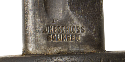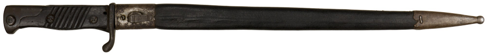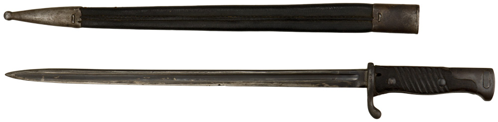 A second pattern model 1898 bayonet, with the two-piece grips introduced in 1902, known as the S 98 nA ("Seitengewehr 98 neuer Art" - Bayonet ‘98 new Pattern), and its original leather scabbard. Blade has been cut down to 38.5cm. Its steel, contoured bird’s head pommel has a stud guide and locking stud. Maker marked.