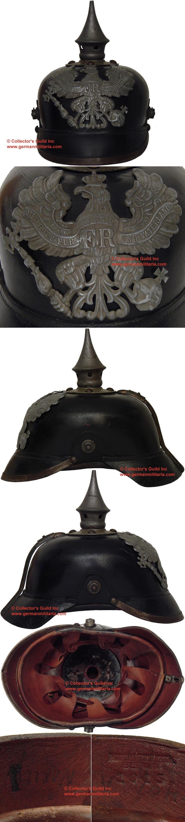 Development of the pickelhaube may be traced back to the Prussian King Friedrich Wilhelm IV who initiated the original design and introduced it for wear by most of the Prussian line Infantry regiments on October 23RD 1842. The pickelhaube became a visual symbol of Prussia’s military might and underwent numerous modifications starting in 1860 and continuing right up until 1915. The Grand Duchy of Baden adopted a somewhat unique pickelhaube in 1849 with major differences from the Prussian pickelhaube of the time. Starting in 1856 the Baden style pickelhaube was modified to conform with the Prussian style and after 1867 any further modifications were identical to the Prussian version excluding the Baden state helmet plate. The demise of the pickelhaube began in the fields of WWI as a result of increased head wounds suffered by the German troops which were mainly caused by grenade and shell fragments. As a result of the increased head wounds and the development of the first "modern" steel helmets by the French army in early 1915 and by the British army later that year the German army began tests for their own steel helmet at the Kummersdorf Proving Grounds in November, and in the field in December 1915. An acceptable pattern was developed and approved and production of the new steel helmets began at the Eisen-und Hüttenwerke, AG Thale/Harz, in the spring of 1916. After the introduction of the M16 helmet the pickelhaube was relegated for wear only on ceremonial occasions.PHYSICAL DESCRIPTION: Model 1915 Preußen (Prussian) leather Pickelhaube. All grey-oxidized steel fittings with , removable M15 spike top, original leather liner, missing chinstrap and both Kokarden. The leather black-lacquered shell and both front and rear leather visors retain a nice gloss finish with some minor age crazing to the lacquer. The helmet body has its two original holes for the M15 Preußen (Prussian) eagle Wappen (front plate) which are grommeted in steel and and match the Wappen perfectly.
