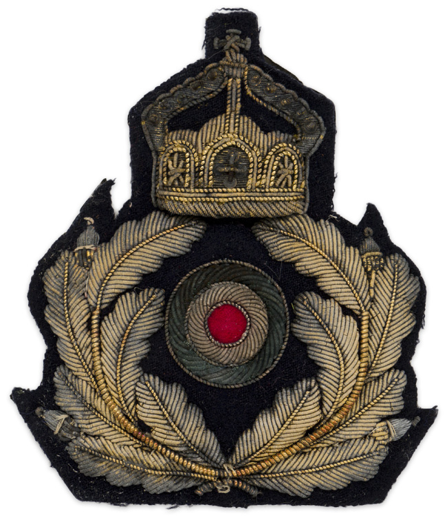 Beautiful hand embroidered Imperial oak-leaf wreath, cockade and crown. The insignia is all super high quality hand embroidered silver & gold bullion wire construction mounted on a dark blue badge cloth/wool. Scarce!