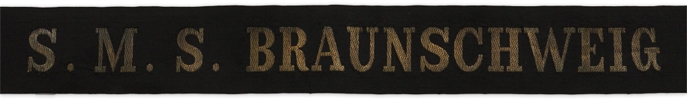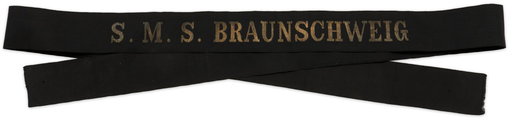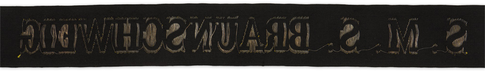 PHYSICAL DESCRIPTION: A 114cm long, black rayon constructed cap talley with machine woven script "S.M.S. Braunschweig ". The top and bottom have chain-like re-enforce stitching. Excellent condition.