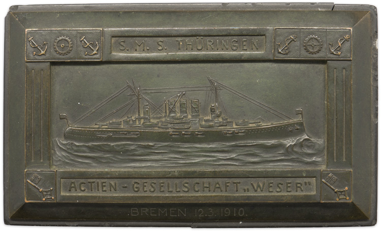 A heavy, cast paper weight measuring 10cm x 16.5cm that reads "S.M.S. Thürigen" "Actien-Gessellschaft "Wesser", Bremen 12.3.1910". The bottom has green felt. Some chipping to eh edges as well as a crack to the front.
