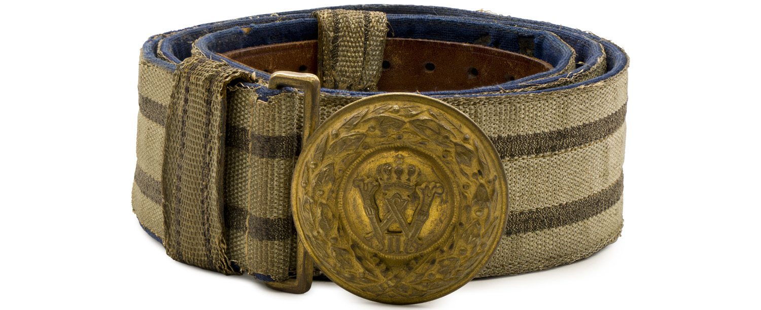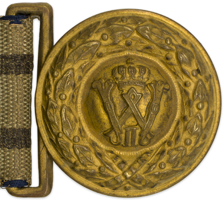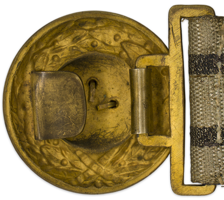 PHYSICAL DESCRIPTION: Nice quality, roughly 45mm wide, 102cm long, bright, silver/aluminum brocade belt with a buckle retaining tongue and a gilt washed, brass, Prussian officer’s buckle. The belt features 10mm wide, evenly spaced, grey, parallel, horizontal stripes. The belt comes with a roughly, 45mm diameter, two piece, gilt washed, brass, Prussian officer’s buckle. The buckle features a highly embossed oak leaf wreath encompassing a central "W" monogram cypher with crown. Adjustable buckle catch is missing. Well worn and used example.