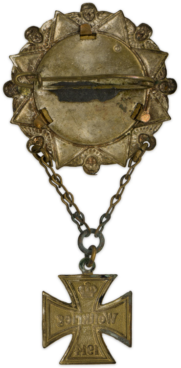 A 35mm diameter badge with a small black and white image displayed to the center. Suspended by a small chain is an Iron Cross that reads "Weltkrieg" and a 1914 date. A simple spring pin is to the reverse.