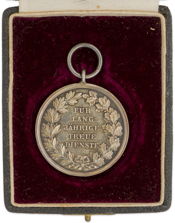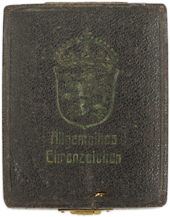 A 33mm diameter medal featuring the left facing profile of the Grand Duke of Hesse surrounded by the words "Ernst Ludwig Grossherzog von Hessen" while the reverse has five lines encompassed by a oak and laurel branch that reads "Für Langjährige Treue Dienste" or "For Many Years of Loyal Service". Included and secured under the lid of the case is the original ribbon. The case measures approximately 2cm x 6cm x 7.5cm that has an embossed design, as well as the words "Allgemeines Ehrenzeichen" ( General Badge of Honor). A small latch is to the front.