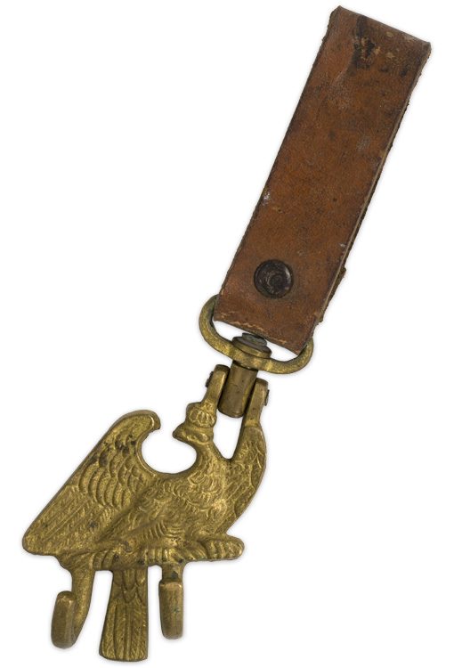 A cast brass drum hanger roughly 50mm at widest point, and 85mm tall, hung from its leather belt loop from a swiveling brass mount. The hanger itself is in the from of a right-facing crowned eagle perched on a horizontal bar from which descend the two hooks for the drum.