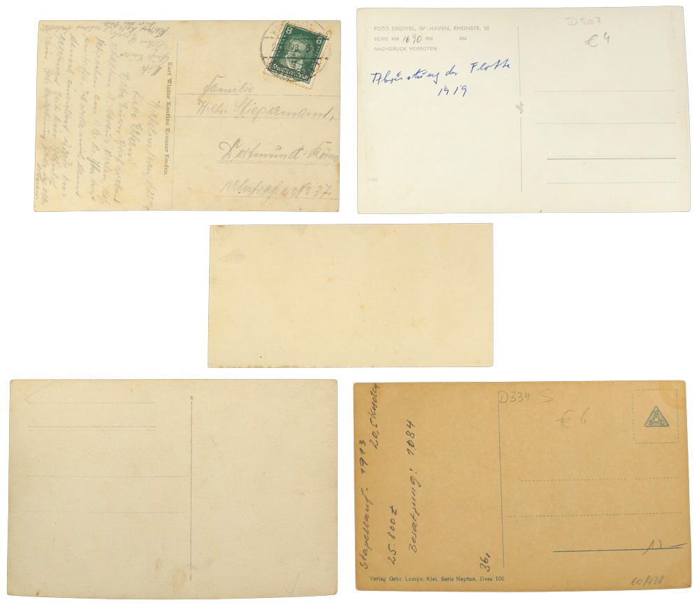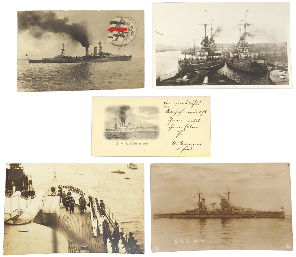 A grouping of four postcards and a note card (S.M.S. Ostfriesland). Three postcards have writing to the reverse.