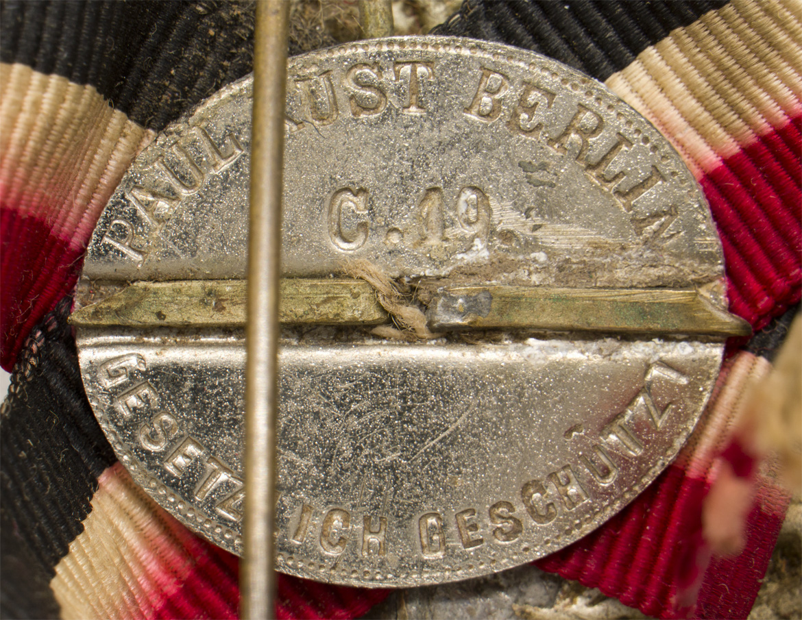 A two piece medal with a black, white and red ribbon. A simple spring pin is to the reverse.