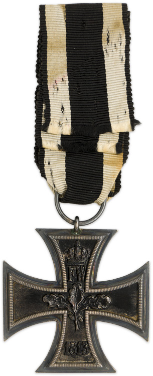 PHYSICAL DESCRIPTION: 1914 pattern, die struck, three piece, iron and alloy construction Pattée style cross with a single piece iron core and two piece silver alloy frame. The obverse of the cross features an embossed, central, "W" cypher for King Wilhelm II, re-institution date, "1914", to the bottom arm and a King’s crown to the top arm. The reverse of the cross features an embossed, central, oak-leaf cluster, with the "FW" cypher for King Friedrich Wilhelm III, a King’s crown to the top arm and the original institution date, "1813", to the bottom arm. All the emblems are in nice high relief. The ribbon suspension loop and ring are both intact. Unmarked. Complete with ribbon.