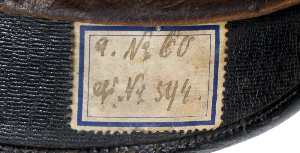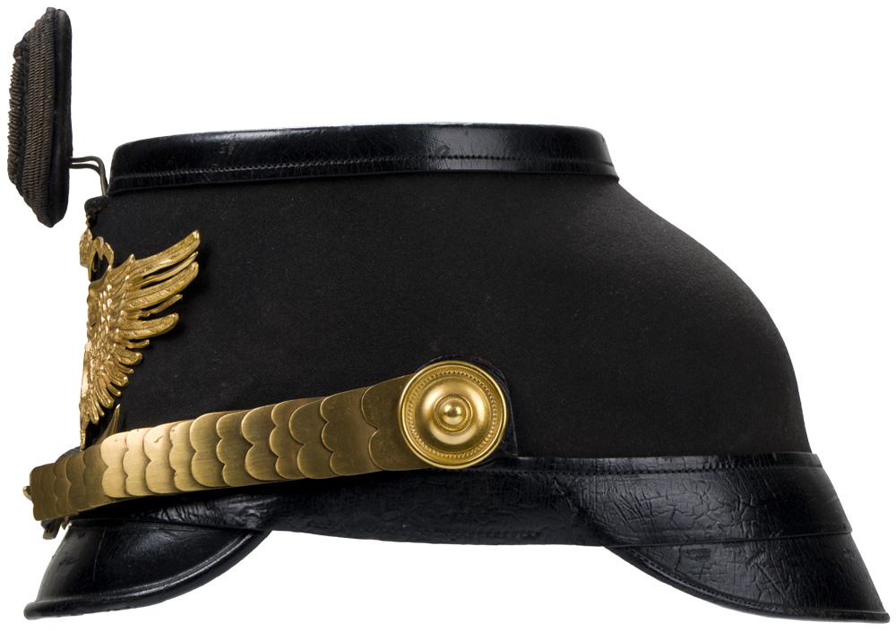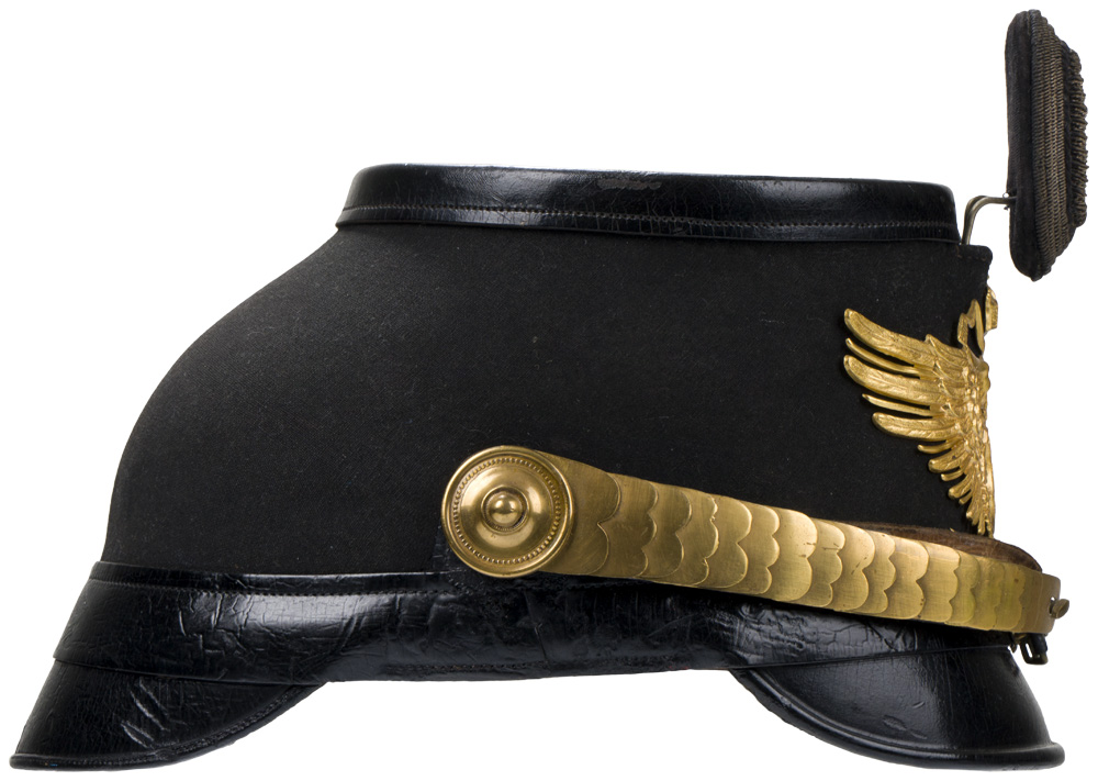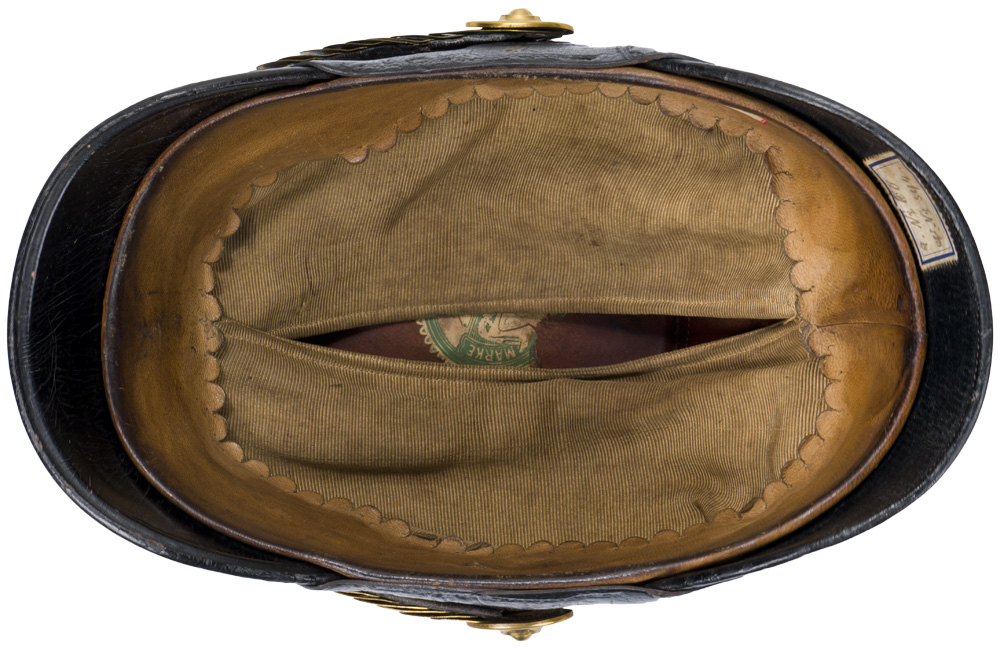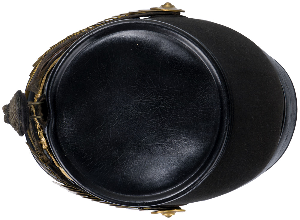 Imperial German Sea Battalion (Marine Corps) Officer’s Shako. Beautiful textbook example of the officer’s shako (brushed black felt body for officers, black leather for enlisted). Perfect original condition. Three labels inside. In the top of the dome behind the officers silk lining is the partially readable makers label in a green circle. Also present are an old museum label (a white rectangle with a blue border) and the collection inventory label from the famous Norm Hobson collection (the number 195 in ink on a white rectangle with a red border.) All of the imperial headgear in the legendary Norm Hobson collection had a label of this description, giving this shako extraordinary provenance and desirability. Officer’s liner in excellent condition but a little soiled. With rare original officer’s Feldzeichen in the slot above the fire gilded See Bataillon eagle.