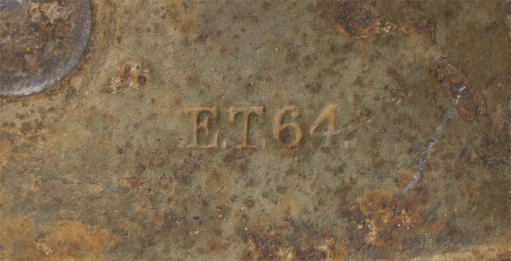 PHYSICAL DESCRIPTION: The stamped, sheet steel construction, helmet retains a good portion of its original paint with a nice overall salty patina. The helmet has both the dome headed chinstrap retaining rivets, both of the extended ventilation side lugs and all three of the flat headed liner retaining rivets. The interior of the helmet has a pre May 1917 pattern leather liner band complete with the original pads. One padding bag remains. Liner has come unstitched at the back seam. One chinstrap M98 attachment is still present. Apron is stamped with the faint, manufacturer’s code and size "ET 64" indicating manufacture by Eisen und Hüttenwerke, AG Thale/Harz, size 64. Nice untouched helmet.