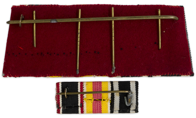 A pair of matching ribbon bars that represent the Iron Cross 2nd Class, the Baden Service Medal and the 1914 Cross of Honour. Each bears an original hinged pin.