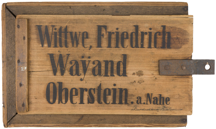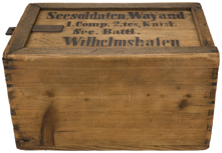 A 20cm x 24cm x 35cm wooden sea locker with sliding lid with iron hasp which would allow a padlock for security. Lid can be reversed. One side of the lid has the soldier’s name and unit stenciled on. In the event of the Marine’s death, the box with his personal effects could be mailed to his widow by flipping the lid over. The reverse side has the name and address of his (if he died) widow (Wittwe). This is a wonderful piece of Imperial German navy history, I have never seen another one. Perhaps the only surviving example of the issue sea locker in which German marines would store their personal items while deployed on board ship.