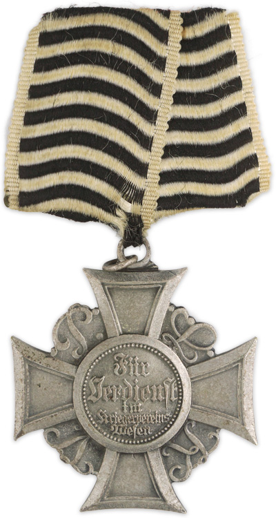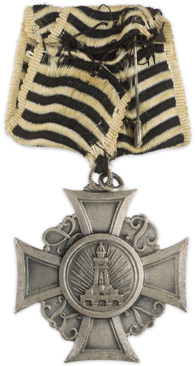 A 4.5cm x 4.5cm pattée style cross with a central design of the Kyffhäuser Monument with the letters "PLKV" (Preussischer Landes Kriegern Verband = Prussian State Veterans Association) between the arms. The reverse features reads "Für Verdienst im Kriegervereins Wesen" (Merit in War Veterans Association). The suspension loop is maker marked "H. Timm Berlin" with a tri-fold ribbon that is hand stitched and safety pin holding the ribbon in place.
