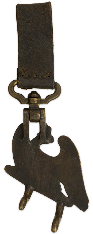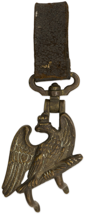 A cast brass drum hanger roughly 75mm at widest point, and 115mm tall, hung from its brown leather belt loop from a swiveling brass mount. The hanger itself is in the from of a right-facing crowned eagle perched on a horizontal bar from which descend the two hooks for the drum. An unmarked example. Shows the expected age and use, but overall nice condition.