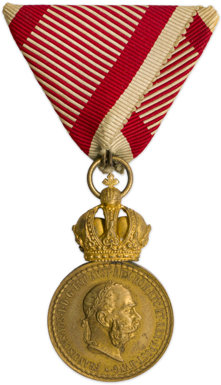 A 30mm diameter bronze medallion showing the bust of the Franz Joseph I to the front, while the reverse reads "SIGNUM LAUDIS" (Latin for "Sign of Praise") surrounded by a wreath, half-laurels and half-oak leaves. The Medal is surmounted by a crown and a war time tri-fold ribbon.