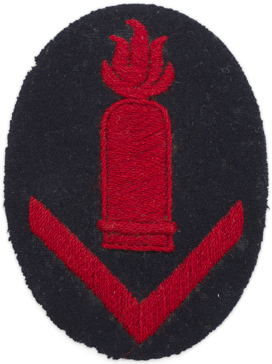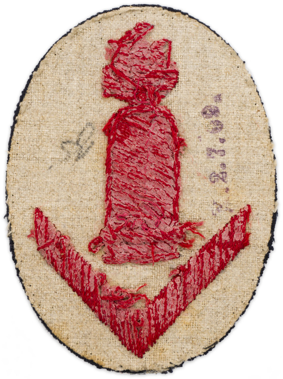 Insignia consists of a roughly, 85mm tall, 60mm wide, vertically oval, navy blue wool base with a embroidered vertical artillery shell with "flames" emanating from the top edge positioned above a single chevron all in bright red cotton threads. Nicely dated for 1909.
