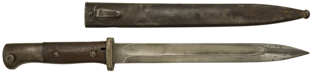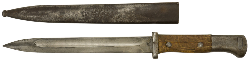 (Seitengewehr)A second pattern (the first were conversions of S 71/84 bayonets) model 1884/98 bayonet, introduced in 1915 as a short-blade wartime utility bayonet, and known as the S 84/98 nA ("Seitengewehr 84/98 neuer Art," or, Bayonet ‘84/‘98 new Pattern), with its original scabbard. Spine is nicely dated for 1915. Blade is 23cm. Scabbard is complete and in decent condition. Maker marked to "J.A. Henkels". Shows the expected age and use. The blade has been shortened, and ground on near the tip. One grip panel has been replaced with a lighter color home made piece of wood. Scarce.