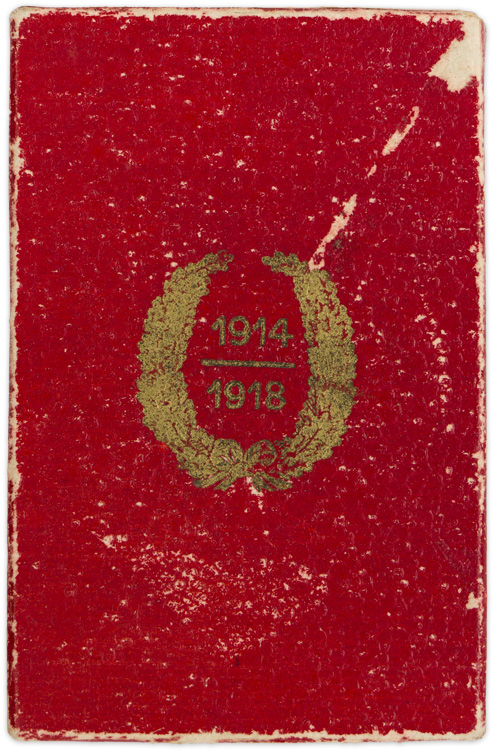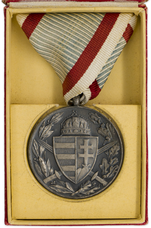 A 37mm diameter alloy medal. To the front is the coat of arms of Hungary, being St. Stephen’s crown atop a shield with horizontal bars to the left, and a double-armed cross, not unlike the cross of Lorraine, to the right. Swords cross diagonally behind the shield, and laurels arch along the left, and oak leaves along the right. To its reverse is a profiled M16 helmet, with "1914-1918" underneath it, a spray of laurels arching along the base, and "Pro Deo Et Patria" (For God And Country) arching along the top. A small ring surmounts the medal, through which is fed a larger ribbon suspension loop. Original ribbon is complete. Included is a two piece cardboard case with paper hinge that measures approximately 6cm x 9cm with gilt embossing that reads "1914 1918".
