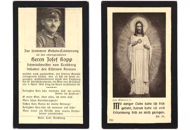 PHYSICAL DESCRIPTION: This black and white double sided card with a black and white portrait photograph of "Herrn Josef Kopp" whose date of death was "4 April 1919" who was awarded the Iron Cross. Below that inscription there is a prayer. The reverse shows a black and white illustration. The card is in good condition with age yellowing and edge wear.