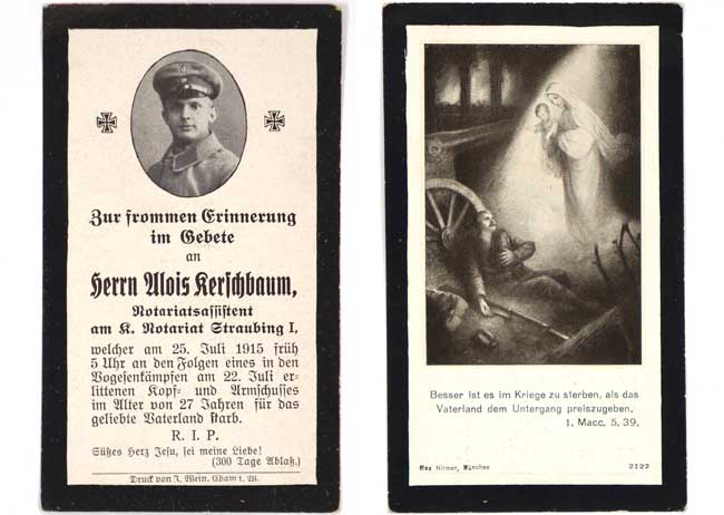 PHYSICAL DESCRIPTION: This black and white double sided card with a black and white portrait photograph of "Herrn Alois Kerschbaum" whose date of death was "25 Juli 1915" (Vogessen battle) at the age of 27. Below that inscription there is a prayer. The reverse shows a black and white illustration. The card is in good condition with age yellowing and edge wear.