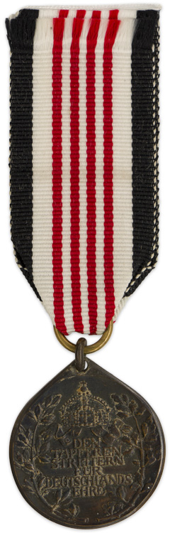 This is the smaller diameter (28 mm) medal struck for native soldiers in service to the German Empire. Worn condition, heavy patina, VG+, on an original ribbon. Very Rare.
