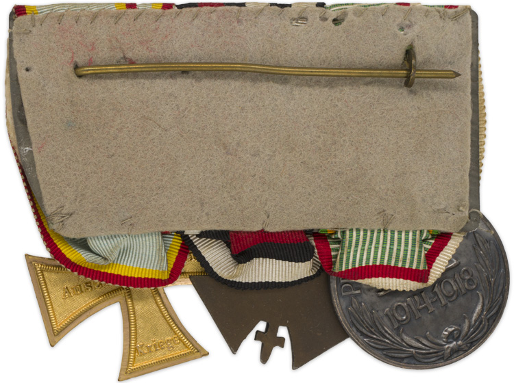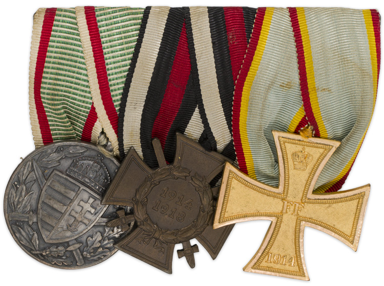 (Groß Ordensschnalle)A medal bar, approximately 3.75" across, from which hangs from left to right the 1914-18 Hungarian Combatant’s Commemorative Service Medal that was instituted May 26, 1929 by Regent, Admiral Horthy. The front shows the weapon shield of Hungary surmounted by a crown with crossed swords. The reverse is engraved "Pro Deo Et Patria / 1914-1918" (for God and Fatherland 1914-1918), with a WWI helmet over "1914-1918." It is suspended from a white, red and green striped ribbon. The second award, a 1914/18 Combatant’s Cross of Honor, was instituted in July 1934 by von Hindenburg (resulting in its erroneous designation as the "Hindenburg Cross") to recognize service in WWI. It ranked beneath bravery awards but above other service and campaign awards. A 1 1/2" square, stamped steel award with a bronze wash, it takes the form of a cross Patté with a circular laurel leaf wreath to its center encompassing the dates "1914" and "1918" and with swords emanating between the cross’s arms, indicating a combatant’s award. The reverse is plain. It is suspended from its original ribbon in narrow black-white-black-red-black-white-narrow black. The Mecklenburg- Schwerin Military Merit Cross Second Class is also in the form of a cross Patté, 4.5cm square, which appears to be made entirely of brass, and which features, to its obverse, "FF" (Friedrich Franz) to its center, beneath a Prussian crown and above the date "1914." To the reverse is "Für" to the upper arm, "Auszeichnung im" across the left and right arms, and "Kriege" to the lower arm (together reading: For Distinction in-the War). Its pebbled core and smooth frame are both still relatively bright. The ribbon is light blue with narrow edge stripes of red and yellow. The grey wool backing shows some slight mothing. A very nice grouping.